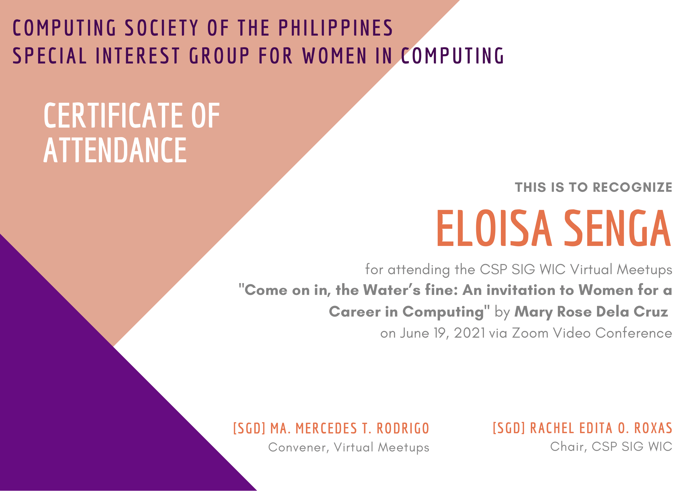 A Webinar entitled "Come on in, the Water’s fine: An invitation to Women for a Career in Computing" led by CSP SIG WIC which was held last June 19, 2021, via Zoom.