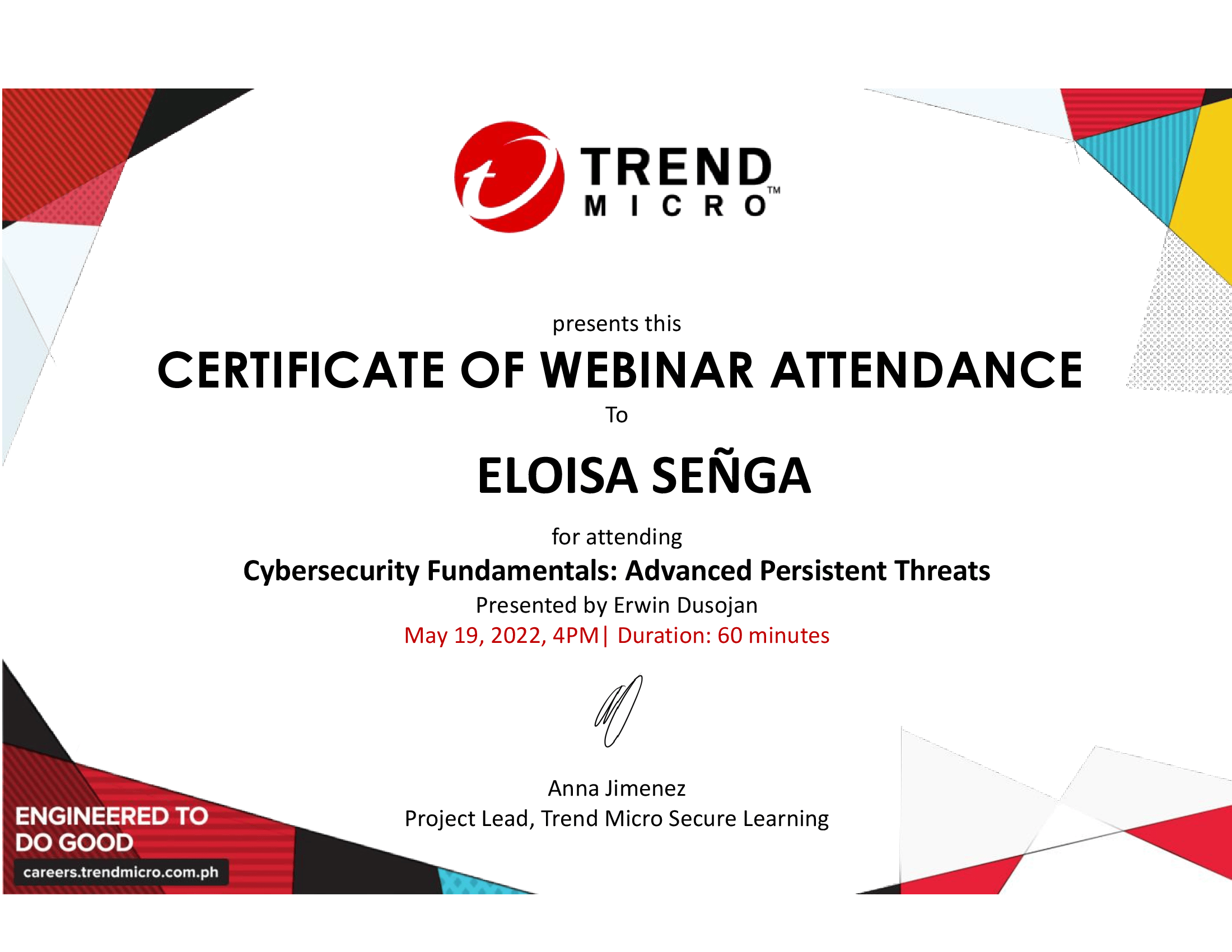 A Webinar entitled "Cybersecurity Fundamentals: Advanced Persistent Threats" led by Trend Micro which was held last May 19, 2022, via Zoom.